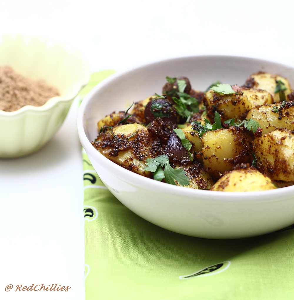 Inspiration as they say comes from unexpected places and this recipe is a testimonial to that. Few weeks ago, I was looking for some North Indian styled recipe using spinach on Sanjeev Kapoor’s website, hoping to find some inspiration and ideas, but few searches and clicks later I landed on a recipe of Spicy Tempered Potatoes called Urulai Chettinadu with which I was pretty impressed. Strange! I would have never imagined searching for Chettinad and Sanjeev Kapoor at the same time.