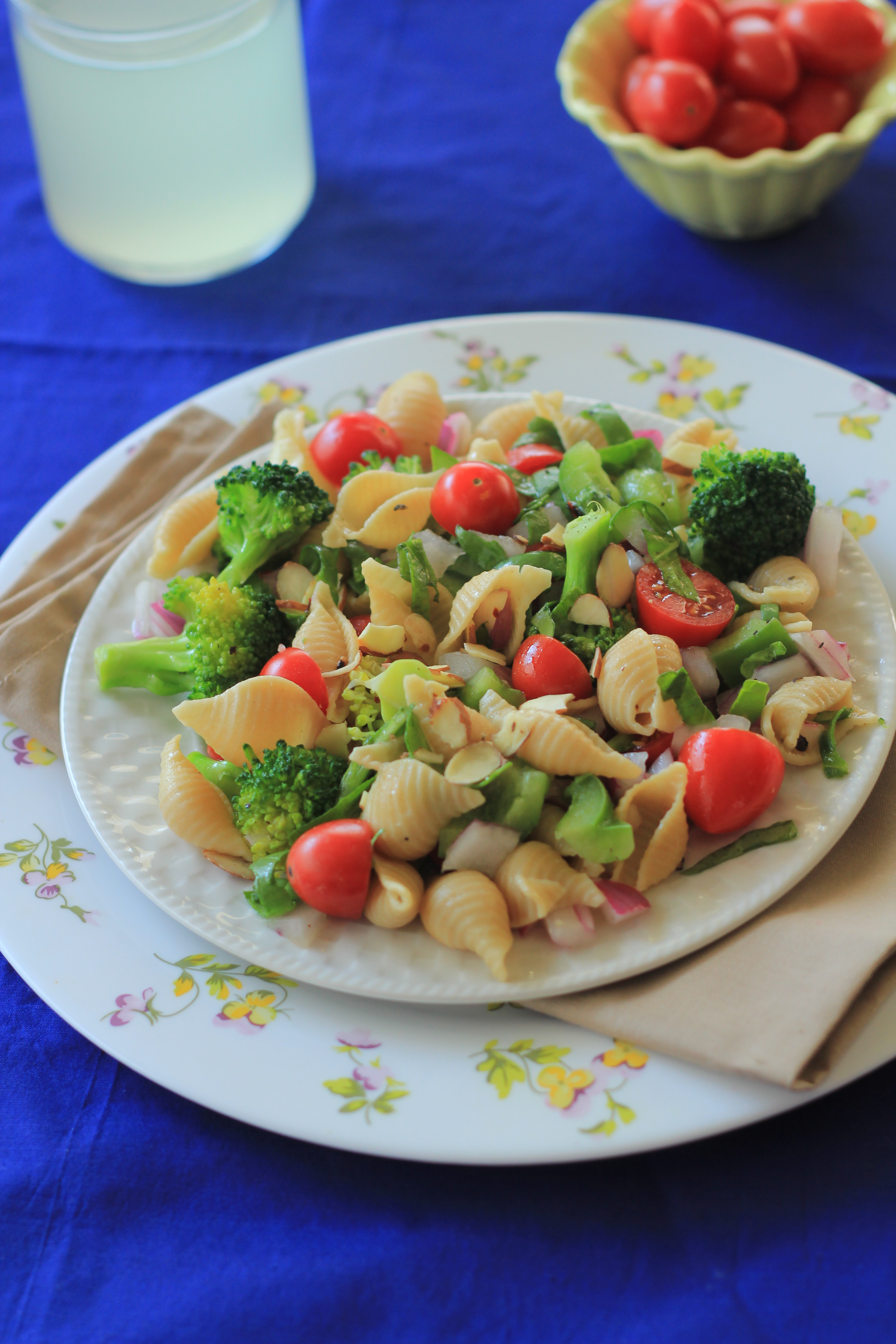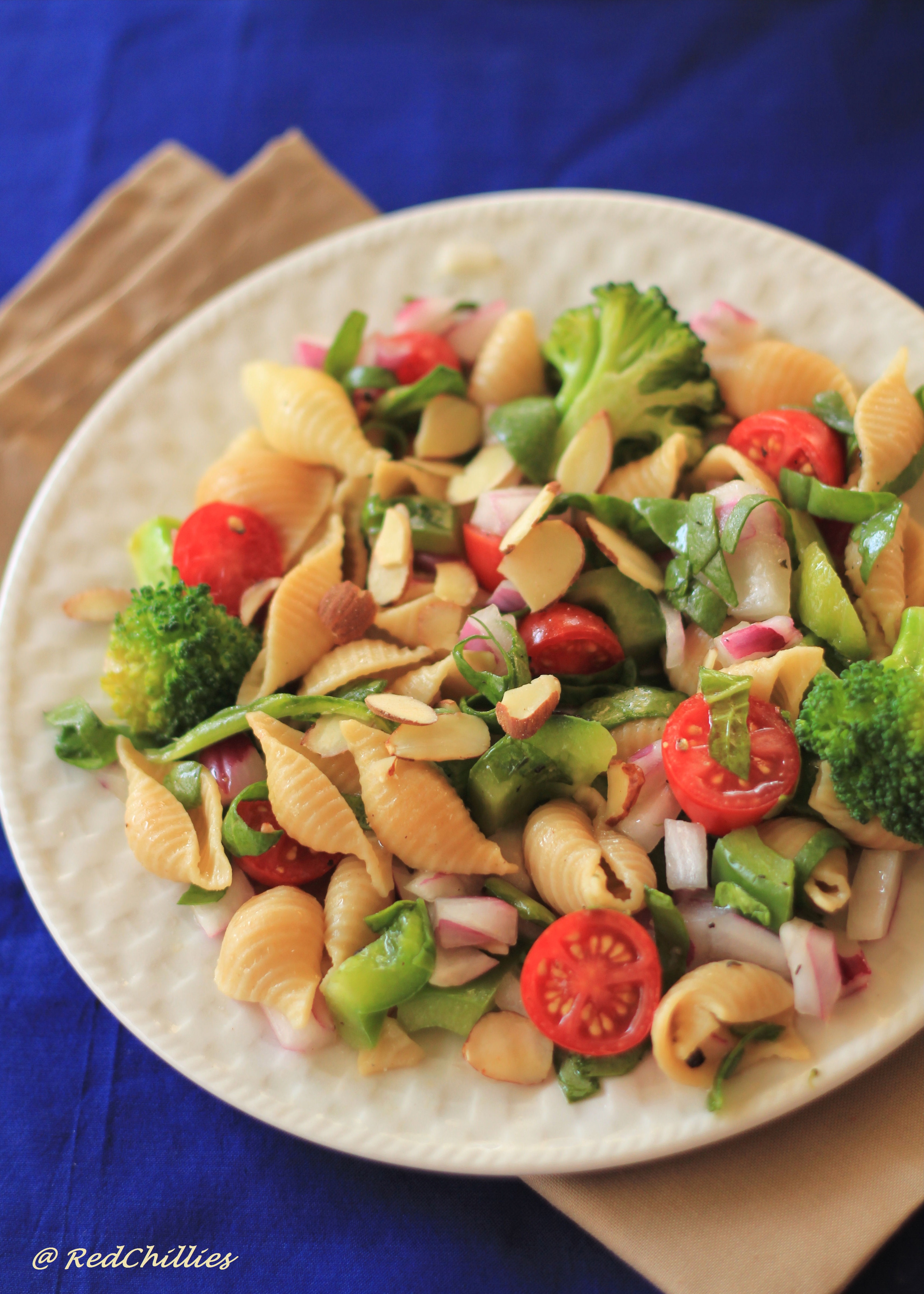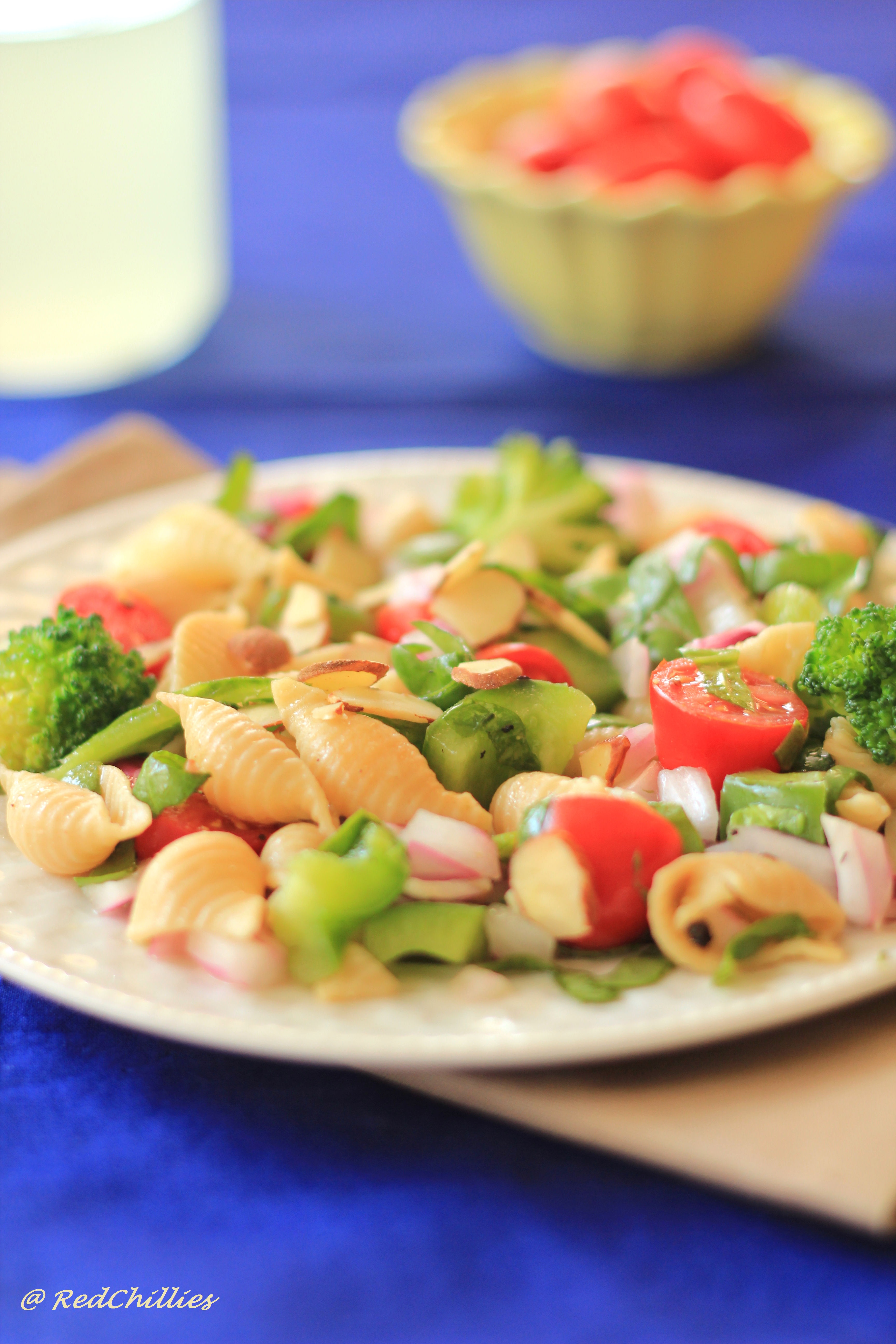 I make this Pasta Salad pretty often at home. With vegetables like celery, cucumber, tomatoes, pepper and onions all tossed in, this is a super healthy, great tasting and low calorie salad. It is lightly dressed with just vinegar and pepper powder. Of course, you can add any dressing of choice if you do not like vinegar.